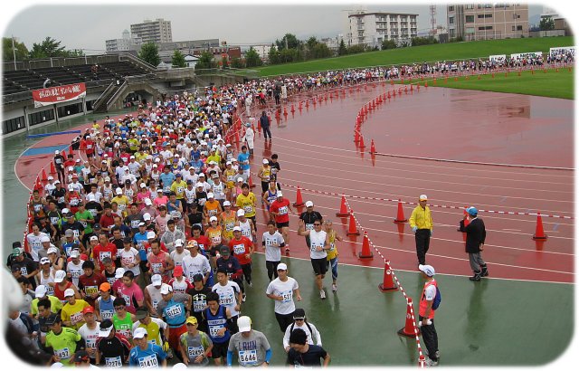 号砲一発!! 競技場を出る3500人の選手の皆さん、イッテ・ラッシャーイ!! |