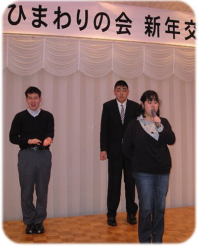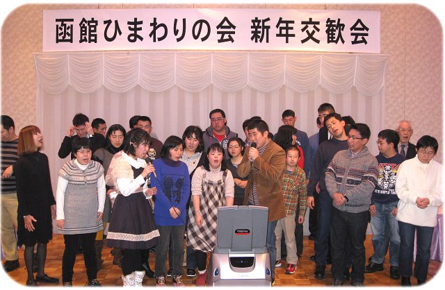 2013年の新しい年を迎えて、ひまわりの会恒例の新年交歓会が行われました。 今年の交歓会は、五稜郭本町のホテル法華クラブを会場に行われました。 会場には73名のお友達、家族の方々が集い、楽しい時を過ごしました。 今年もまた、懐かしいお友達がたくさん集まりました。現役では市内の特別 支援学級や学校、更に今金や伊達、七飯などの特別支援学校に通うお友だち、 そして市内、近郊の施設、作業所に通うお友達、さらに一般就労にたずさわる お友達も参加しました。 藤井先生の新年の挨拶のあと、長谷川富美さんが、お友達を代表して乾杯 の音頭をとり、みんなで楽しく昼食を頂きました。また、今年、成人を迎えた3人の お友達をみんなで祝いました。 昼食後は、ステージに上がりカラオケタイム、みんなでいい日旅立ちの歌を 大合唱し、ビンゴゲームの後、高垣先生の終わりの言葉で楽しい会を閉じました。 | ![]() |